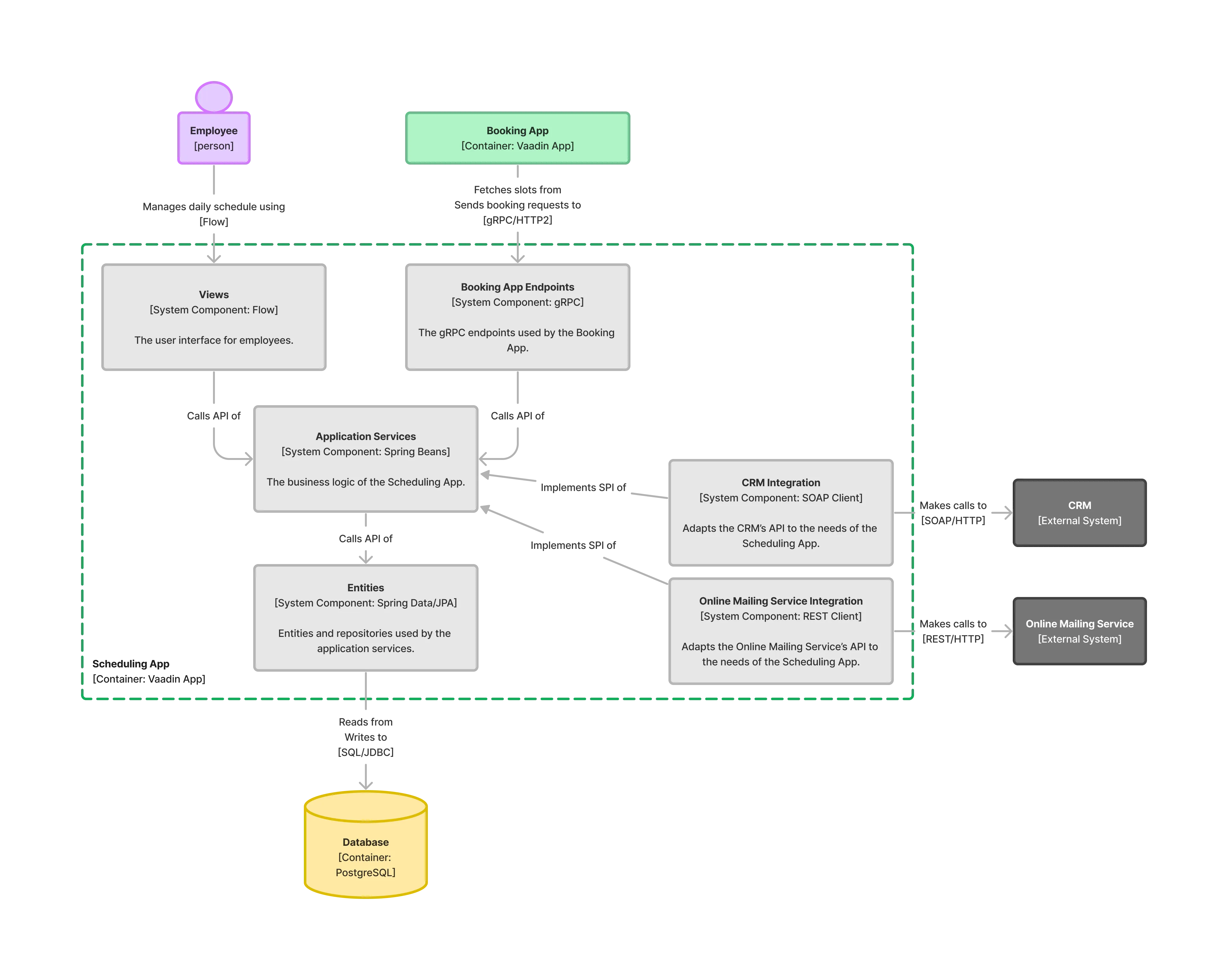 Continuing with the fictional appointment scheduling system example, zooming in on the scheduling application container gives the following component diagram: