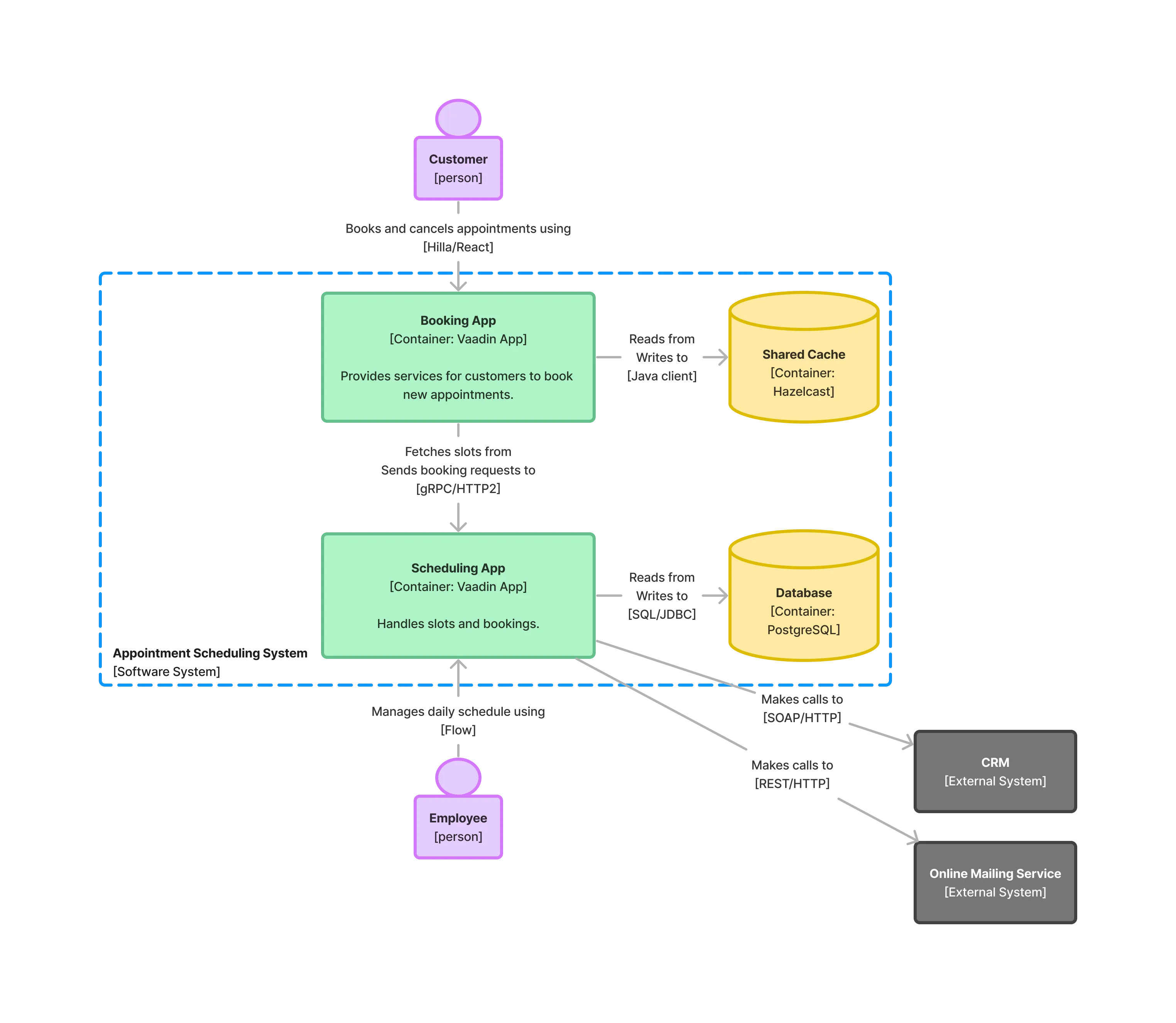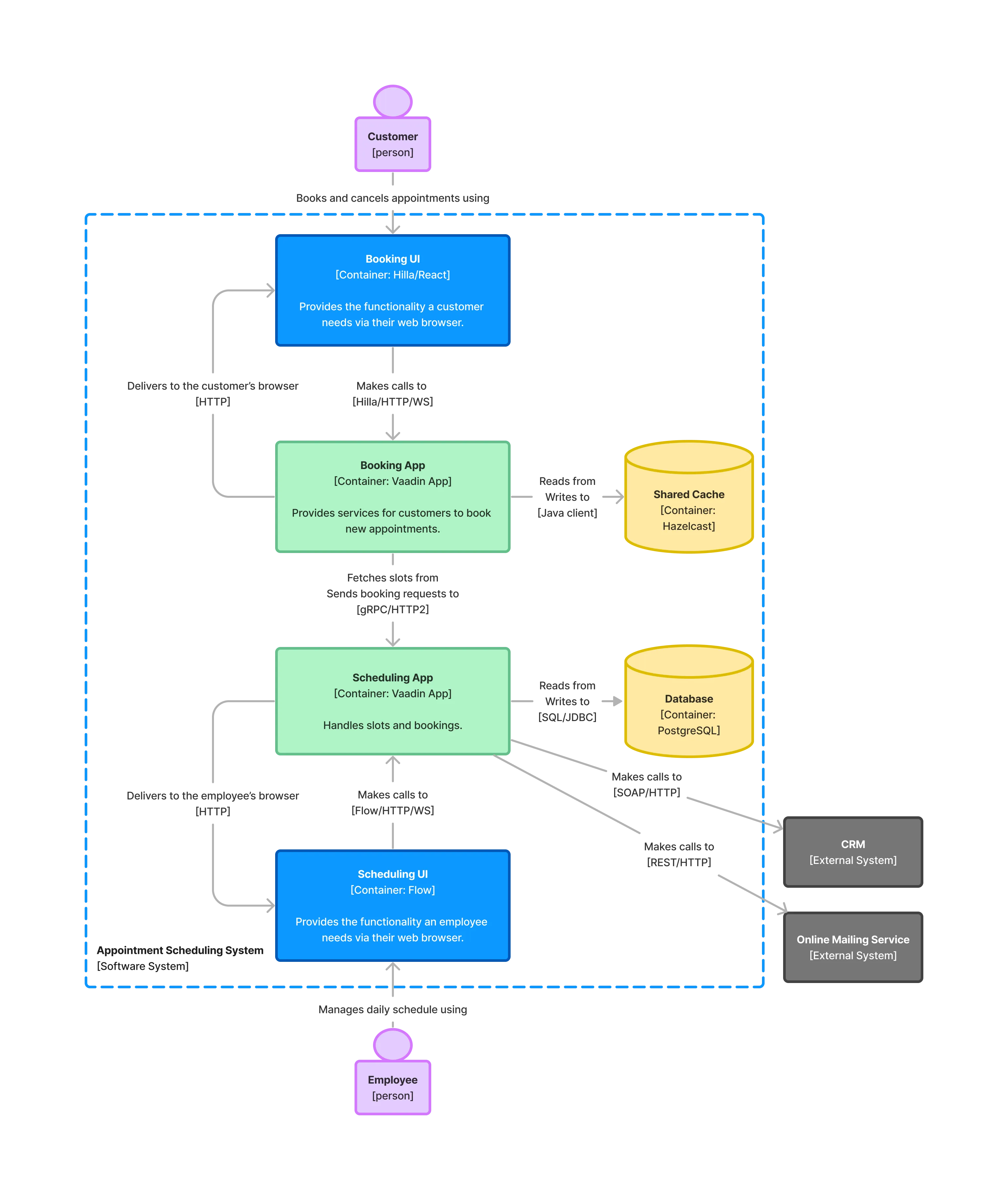 As you can see, the diagram reveals a lot more details than the context diagram. You can see that the system consists of six containers: two web browsers (the employee’s and the customer’s), two Vaadin applications, a Hazelcast shared cache and a PostgreSQL database. You can see that the employee-facing user interface is using Flow and the customer-facing user interface is using Hilla and React. You can also see how the containers communicate with each other and with the external systems.