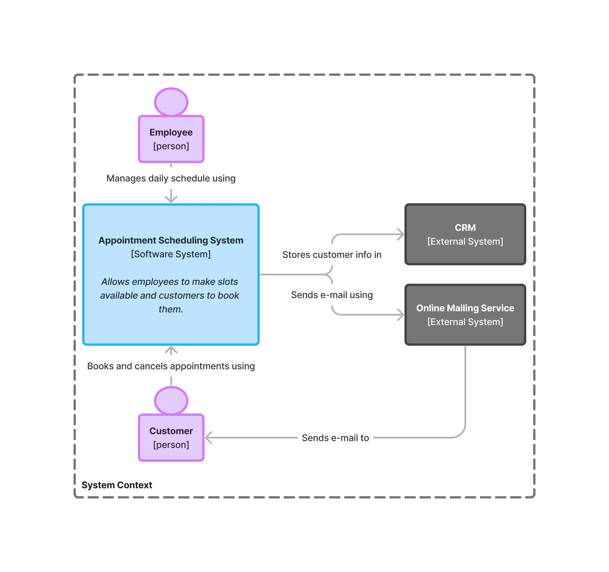 Here is an example system context diagram of a fictional appointment scheduling system:
